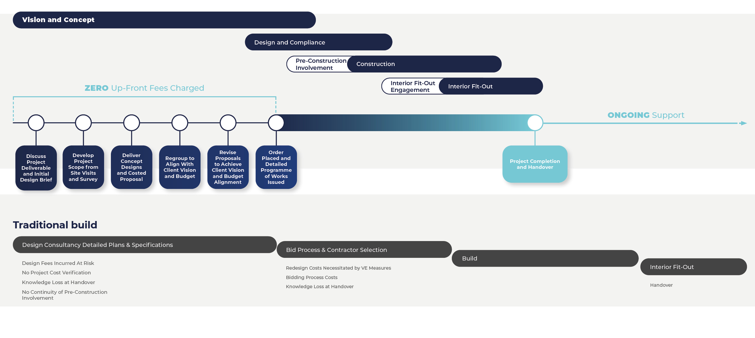 In the traditional model, design and construction phases are handled separately. A school will typically commission architects to draw up plans, then tender for a contractor to carry out the build. The scoping, design and specification process can be both complex and expensive before any work has even started on site. This leads to longer programmes, increased risk and limited cost control.